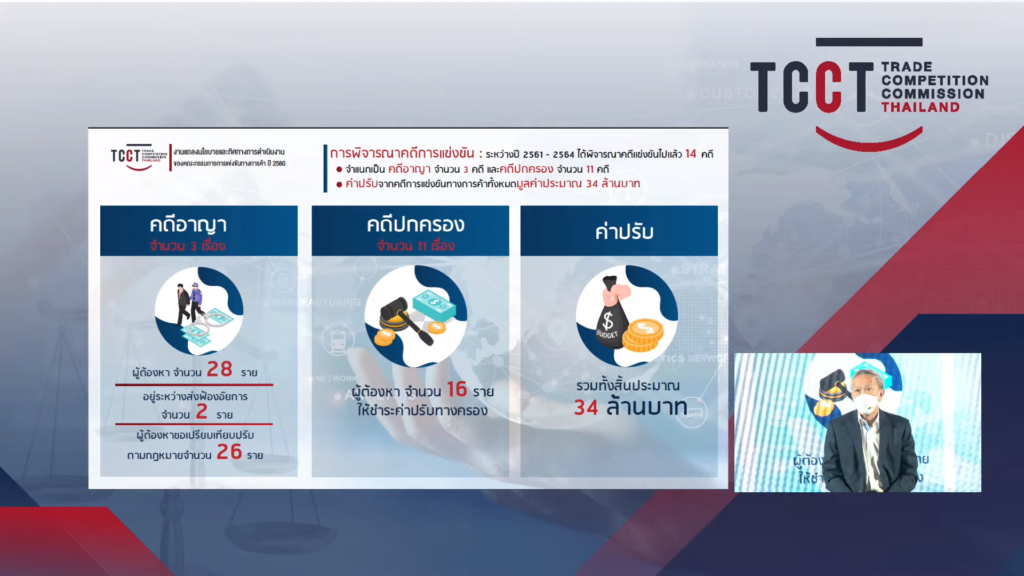 การพิจารณาคดีการแข่งขัน : ระหว่างปี 2561 – 2564 ได้พิจารณาคดีแข่งขันไปแล้ว 14 คดี จำแนกเป็น คดีอาญา จำนวน 3 คดี และคดีปกครอง จำนวน 11 คดี โดยค่าปรับจากคดีการแข่งขันทางการค้าทั้งหมดมูลค่าประมาณ 34 ล้านบาท