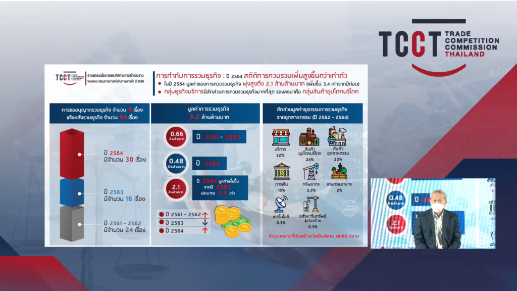 การกำกับการรวมธุรกิจ ในปี 2564 สถิติการควบรวมเพิ่มสูงขึ้นกว่าเท่าตัว มูลค่าของการควบรวมธุรกิจ พุ่งสูงถึง 2.1 ล้านล้านบาท (เพิ่มขึ้น 3.4 เท่าจากปีก่อน) กลุ่มธุรกิจบริการมีสัดส่วนการควบรวมธุรกิจมากที่สุดถึง 32% รองลงมาคือกลุ่มสินค้าอุปโภคบริโภค 24%