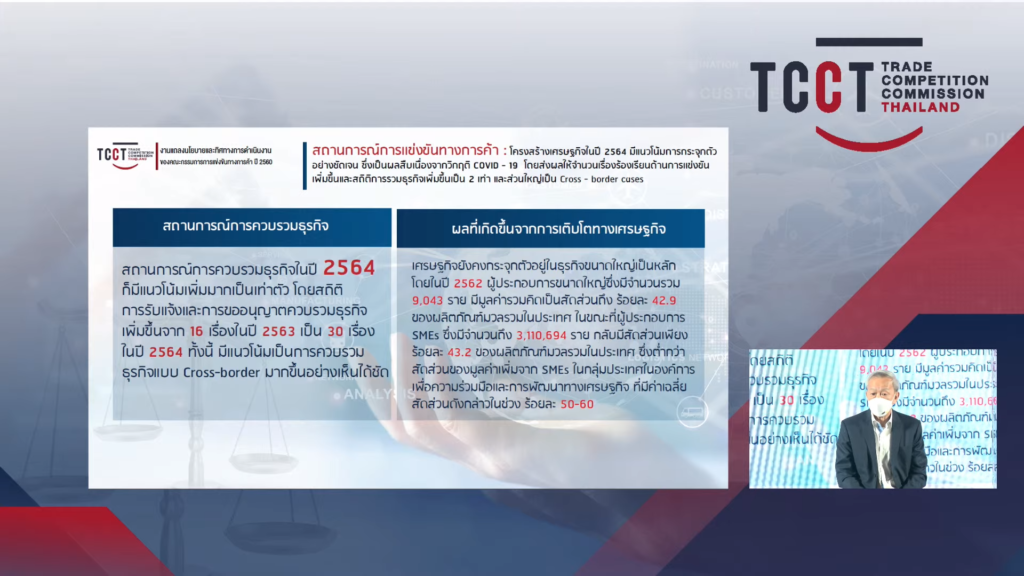 สถานการณ์การแข่งขันทางการค้าจากโครงสร้างเศรษฐกิจในปี 2564 มีแนวโน้มการกระจุกตัวอย่างชัดเจน ซึ่งเป็นผลสีบเนื่องจากวิกฤติ COVID – 19 โดยส่งผลให้จำนวนเรื่องร้องเรียนด้านการแข่งขันเพิ่มขึ้นและสถิติการรวมธุรกิจเพิ่มขึ้นเป็น 2 เท่า และส่วนใหญ่เป็น Cross – border cases