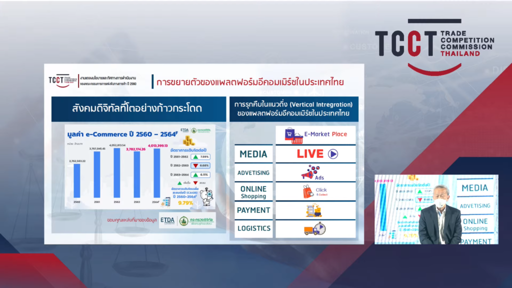 จากการสำรวจของ ETDA พบว่ามูลค่าการเติบโตของเศรษฐกิจดิจิทัลเพิ่มขึ้นอยู่ตลอด อัตราการเติบโตเฉลี่ยสะสมต่อปี 2560-2564 ถึง 9.79% สิ่งที่น่ากังวลคือ การเข้ามาของธุรกิจดิจิทัล โดยเฉพาะ E-Commerace นั้น มีผู้ให้บริการไม่กี่ราย ทิศทางการประกอบการธุรกิจ E-Commerace รายใหญ่มีการรุบคืบในแนวดิ่ง (Vertical Inyregration) เบล็ดเสร็จภายในแพลตฟอร์มของตนเพิ่มมากขึ้น สิ่งเป็นเรื่องที่ต้องจับตามอง เพราะการดูแลธุรกิจในเชิงแนวดิ่ง (Vertical Inyregration) ยังไม่มีหน่วยงานที่มีกฎหมาย มีอำนาจและบทบาทในการกำกับเชิงโครงสร้างอย่างชัดเจน