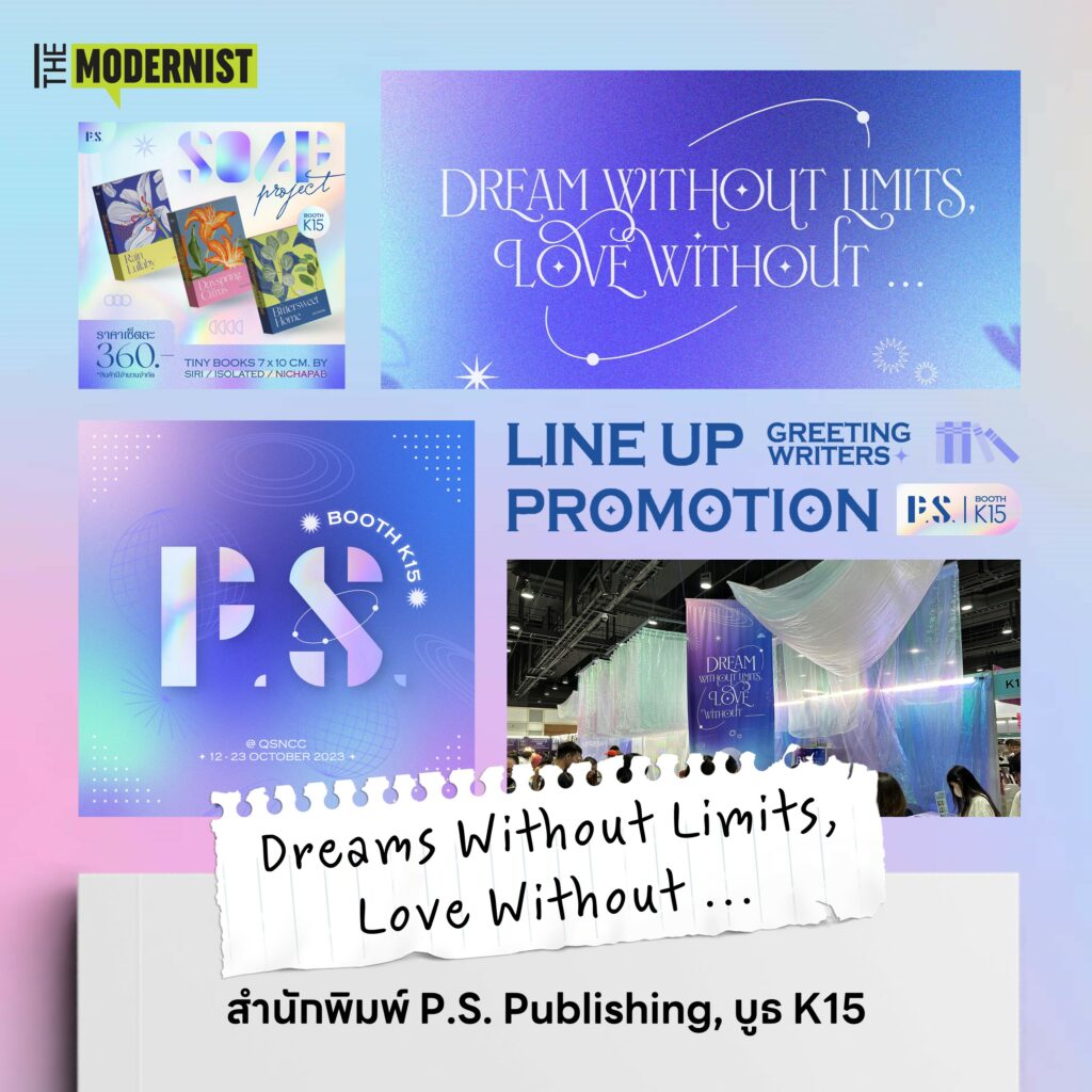 อีกหนึ่งบูธสุดอาร์ตประจำงานหนังสือครั้งนี้อย่างบูธของสำนักพิมพ์ ‘P.S. Publishing’ มาในธีม ‘Dreams Without Limits, Love Without …’ ที่อ้างอิงธีมหลักมาจากธีมของงานมหกรรมหนังสือระดับชาติ ครั้งที่ 28 อีกทอดหนึ่ง โดยธีมงานหลักครั้งนี้คือ ‘Book Dreams’ ที่ว่าด้วยการเปิดหน้าต่างบานใหม่ ให้ทุกคนเดินทางสู่โลกในฝันของนักอ่าน ด้วยจำนวนหนังสือกว่า 1 ล้านเล่มภายในงานที่รอให้นักอ่านค้นพบ