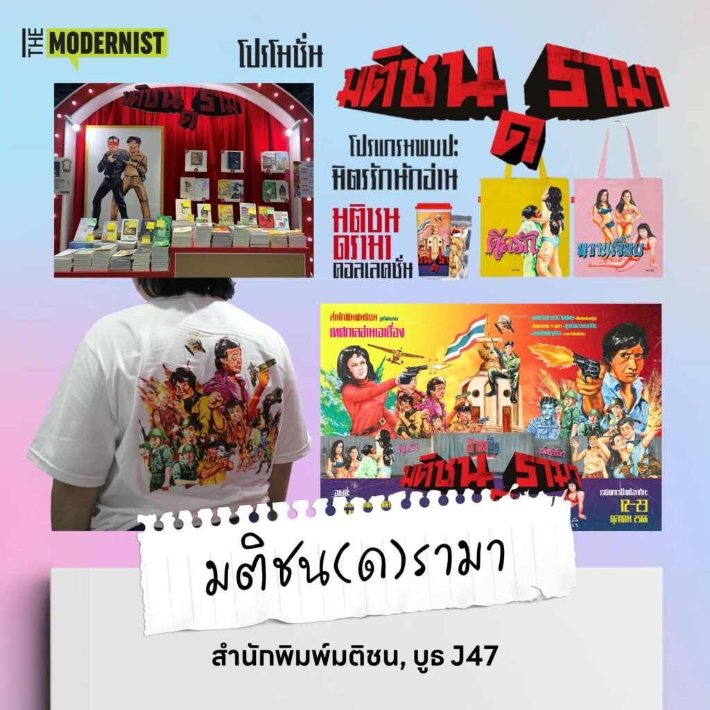 อีกหนึ่งบูธสุดมันส์และน่าจดจำในงานหนังสือครั้งนี้อย่าง ‘สำนักพิมพ์มติชน’ ที่เลือกธีมภาพยนตร์ยุค 60-70 ในชื่อ ‘มติชน(ด)รามา’ ได้อย่างมีเอกลักษณ์ และใส่สุดทุกทางจนเราต้องซูฮก อีกทั้งยังมาในช่วงเวลาเหมาะเจาะที่สังคมไทยกำลังประโคมกลิ่นอาย Nostalgia อย่างเป็นบ้าเป็นหลัง