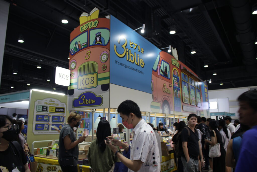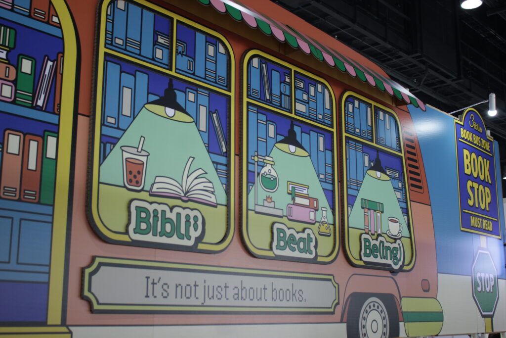 หากใครได้แวะเวียนไปที่บูธของ ‘Biblio’ ก็จะเห็นถึงการตกแต่งด้วยรูปรถบัสทั้งคัน ที่เสมือนกับว่ารถหนังสือคันนี้ของสำนักพิมพ์ได้มาจอดบริการนักอ่านในงาน ก่อนที่จะเดินทางออกไปยังพื้นที่อื่น ๆ บรรยากาศภายในบูธแสนอบอุ่น และกรุ่นกลิ่นวันวาน พร้อมทั้งความทันสมัยจากสไตล์กราฟิก และสีพีช-เขียว-เหลือง-ฟ้า ที่ช่วยพาความน่ารักสู่สายตานักอ่านที่มาแวะเวียนที่บูธได้เป็นอย่างดี
