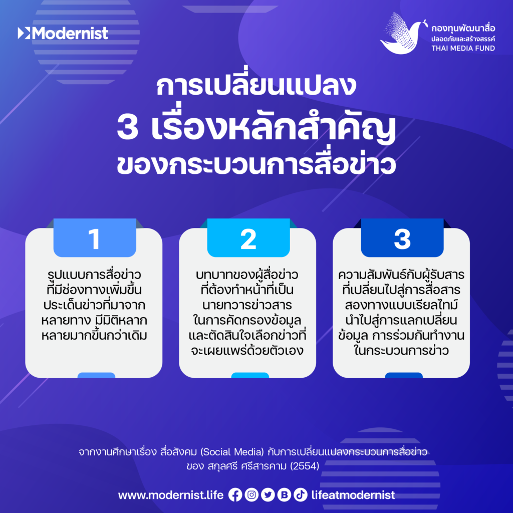 ผลการศึกษาจากการวิจัยชิ้นดังกล่าวพบว่า กระบวนการสื่อข่าวเกิดการเปลี่ยนแปลงใน 3 เรื่องหลักสำคัญ ประการแรกรูปแบบการสื่อข่าวที่มีช่องทางเพิ่มขึ้น ประเด็นข่าวที่มาจากหลายทาง มีมิติหลากหลายมากขึ้นกว่าเดิม ประการที่สองบทบาทของผู้สื่อข่าวที่ต้องทำหน้าที่เป็นนายทวารข่าวสารในการคัดกรองข้อมูลและตัดสินใจเลือกข่าวที่จะเผยแพร่ผ่านสื่อสังคมด้วยตัวเองนำไปสู่คำถามเรื่องความรอบคอบและจริยธรรม จรรยาบรรณที่ต้องเน้นหนักมากขึ้น และประการสุดท้ายคือความสัมพันธ์กับผู้รับสารที่เปลี่ยนไปสู่การสื่อสารสองทางแบบเรียลไทม์ นำไปสู่การแลกเปลี่ยนข้อมูล การร่วมกันทำงานในกระบวนการข่าว ซึ่งเป็นการเปิดมุมมองใหม่ของการทำข่าวสู่ความหลากหลายที่ต่างจากกระบวนการสื่อข่าวแบบดั้งเดิม (สกุลศรี ศรีสารคาม, 2554)