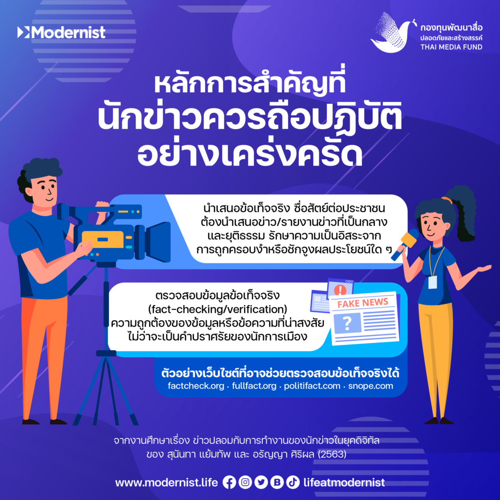 ดังนั้นผู้สื่อข่าวหรือนักข่าวควรมีหน้าที่ในการตรวจสอบข้อมูล ข้อเท็จจริง และความน่าเชื่อถือของข้อมูลนั้นก่อนที่จะเลือกนำเสนอ จากงานวิจัยเรื่อง ข่าวปลอมกับการทำงานของนักข่าวในยุคดิจิทัล โดย สุนันทา แย้มทัพ และ อรัญญา ศิริผล (2563) ได้นำเสนอว่า ในสถานการณ์ปัจจุบันท่ามกลางการเกิดขึ้นของข่าวปลอมจำนวนมาก หลักการสำคัญที่นักข่าวควรถือปฏิบัติอย่างเคร่งครัด ในฐานะนักข่าวมืออาชีพที่รับผิดชอบต่อสังคมและทำงานบริการให้แก่สังคมสาธารณะ ได้แก่ หลักการแรก การนำเสนอข้อเท็จจริง ซื่อสัตย์ต่อประชาชน ต้องนำเสนอข่าว/รายงานข่าวที่เป็นกลางและยุติธรรม รักษาความเป็นอิสระจากการถูกครอบงำหรือชักจูงผลประโยชน์ใด ๆ ไม่เอนเอียงต่ออำนาจและผลประโยชน์ รวมทั้งต้องรักษาหน้าที่เป็นเวทีเปิดความเห็นวิพากษ์วิจารณ์ตรวจสอบกลุ่มอำนาจให้แก่สาธารณชน หลักการที่สอง การตรวจสอบข้อมูลข้อเท็จจริง (fact-checking/verification) ความถูกต้องของข้อมูลหรือข้อความที่น่าสงสัย ไม่ว่าจะเป็นคำปราศรัยของนักการเมือง สำหรับเว็บไซต์ที่อาจช่วยตรวจสอบข้อเท็จจริงได้ เช่น factcheck.org, fullfact.org, politifact.com, snope.com เป็นต้น