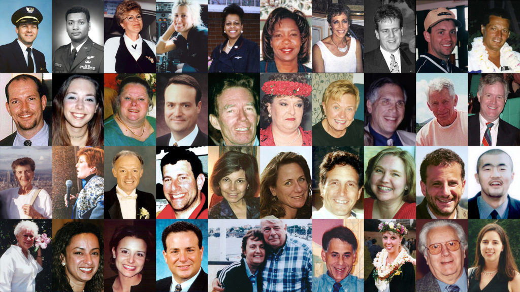 เหตุการณ์ 11 กันยายน 2001 มีผู้เสียชีวิตทั้งหมดเป็นจำนวนมากกว่า 3000 คน ประกอบด้วยการพลเรือนที่เสียชีวิตที่นิวยอร์กบนอาคารตึกแฝดและภาคพื้นดินราว ๆ 2600 คน ทหารและพลเรือนที่เสียชีวิตที่อาคารเพนตากอน 125 คน นักดับเพลิงที่เสียชีวิตจากการปฏิบัติหน้าที่ในนิวยอร์กราว ๆ 340 คน ผู้ก่อการร้ายที่ทำการจี้เครื่องบิน 19 คน และผู้โดยสารบนเครื่องบินทั้งสี่ลำ 246 คน (ไม่มีผู้ใดบนเครื่องบินทั้งสี่ลำรอดชีวิตแม้แต่คนเดียว)