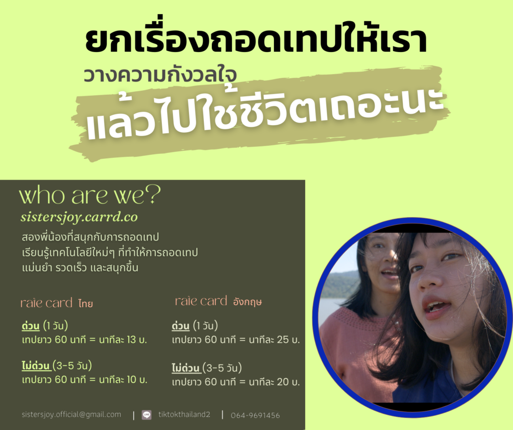 “เราคิดว่า Pain Point หลักของมนุษยชาติไม่ว่าจะยุคสมัยไหน ก็คือเรื่องของเวลาค่ะ สังเกตว่า นวัตกรรมหลายอย่างที่เกิดขึ้นและได้รับความนิยมบนโลก มักจะเป็นนวัตกรรมที่แก่นแท้ของมันมาเพื่อช่วยประหยัดเวลามนุษย์ ไม่ว่าจะเป็นเครื่องซักผ้า เครื่องอบผ้า รถยนต์ที่มาแทนรถม้า เครื่องบิน คอมพิวเตอร์ เป็นต้น โดยส่วนตัวเราเป็นคนที่ให้คุณค่ากับเวลาพักผ่อนมาก และเราก็รู้สึกว่า มนุษย์ทุกคนก็ต้องการสิ่งนี้แหละค่ะ แล้วพอเราเจอเครื่องมือที่มันช่วยให้เราทำงานได้ไวขึ้น ส่งมอบงานได้ดีขึ้น โดยที่เราก็ยังมีเวลาเหลือไปใช้ชีวิตเหมือนกัน เราเลยคิดว่า บริการนี้น่าจะมีกลุ่มลูกค้าที่สนใจนะ มันอาจไม่ใช่ทุกคนบนโลกที่อยากใช้บริการนี้ แต่มันมีกลุ่มที่เขาสนใจแน่ๆ เพราะมันจะช่วยให้เขามีเวลาเหลือไปใช้ชีวิตเหมือนกัน เรามองว่า service นี้เป็น win-win ด้วยกันทั้งคู่ และธุรกิจส่วนใหญ่ก็น่าจะต้องเริ่มต้นกันแบบนี้แหละค่ะ ด้วยการเสนอสินค้าหรือบริการ ที่ win กับธุรกิจ และ win กับผู้บริโภคด้วยนั่นจึงเป็นที่มาของสโลแกน ‘ยกเรื่องถอดเทปให้เรา วางความกังวลใจ แล้วไปใช้ชีวิตเถอะนะ’ ” ติ๊กต็อกกล่าว