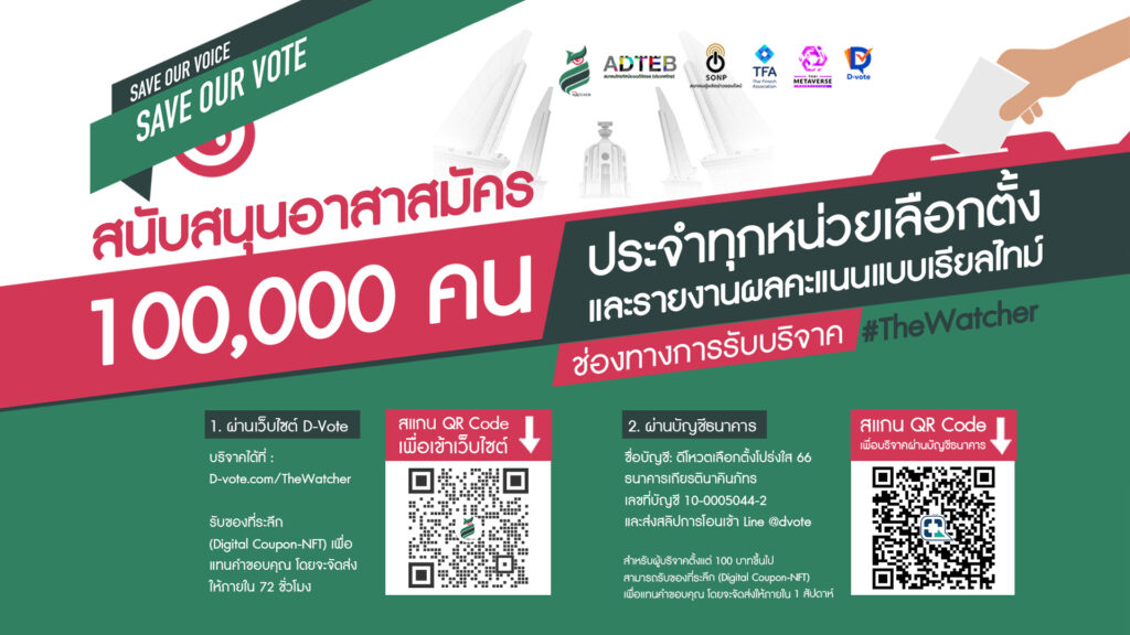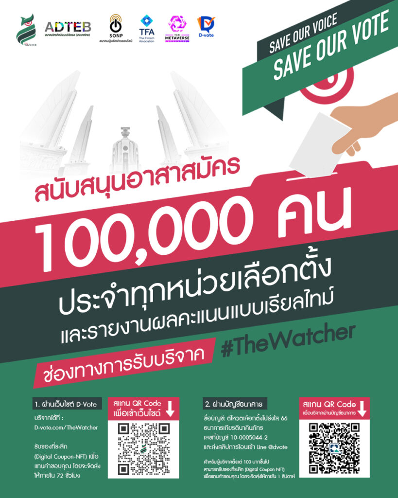 เครือข่ายกว่า 50 องค์กร นำโดยสมาคมโทรทัศน์ระบบดิจิตอล (ประเทศไทย), สมาคมผู้ผลิตข่าวออนไลน์, สมาคมฟินเทคประเทศไทย, สมาคมเมตาเวิร์สไทย, D-vote ฯลฯ ผนึกกำลังส่งอาสาสมัคร 100,000 คน เฝ้าทุกหน่วยเลือกตั้ง 95,000 หน่วย ครบทั้ง 400 เขต เพื่อรายงานผลคะแนนเลือกตั้ง’ 66 แบบเรียลไทม์ ผ่านแอปพลิเคชั่นที่กำลังพัฒนาใช้ในการรายงานผลคะแนนเลือกตั้งครั้งนี้ อย่างถูกต้อง รวดเร็ว หากเกิดปัญหาก็สามารถตรวจสอบได้ทันท่วงทีมากที่สุด
