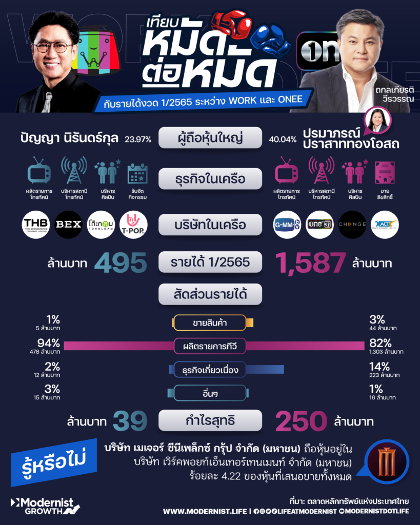 หากจะพูดถึงสถานีโทรทัศน์สองช่องที่ขับเคี่ยวกันไปมา นอกจากช่อง 3HD และช่อง 7HD แล้ว ยังมีอีกสองช่องที่ดำเนินการผลิตเนื้อหาที่มีจุดแข็งคนละด้าน แต่แข่งขันกันมากพอสมควร นั่นก็คือ “เวิร์คพอยท์” และ “ช่องวัน 31” ซึ่งปัจจุบันทั้งสองบริษัทนี้อยู่ในตลาดหลักทรัพย์แห่งประเทศไทย โดยช่องวัน 31 ยังมีช่องในบริหารการตลาดให้ คือ ช่องจีเอ็มเอ็ม 25 อีกด้วย ภายใต้บริษัทแม่ คือ บมจ.เดอะ วัน เอ็นเตอร์ไพรส์ ส่วนช่องเวิร์คพอยท์ มีบริษัทแม่ในชื่อเดียวกันคือ บมจ.เวิร์คพอยท์ เอ็นเทอร์เทนเมนท์ และทั้งสองบริษัทได้ส่งงบการเงินประจำไตรมาสที่ 1/2565 ไปเมื่อวันที่ 11 พฤษภาคม 2565 วันนี้ Modernist ขอพาไปเทียบรายได้ของทั้งสองบริษัทกันแบบหมัดต่อหมัดให้ทุกคนทราบกัน